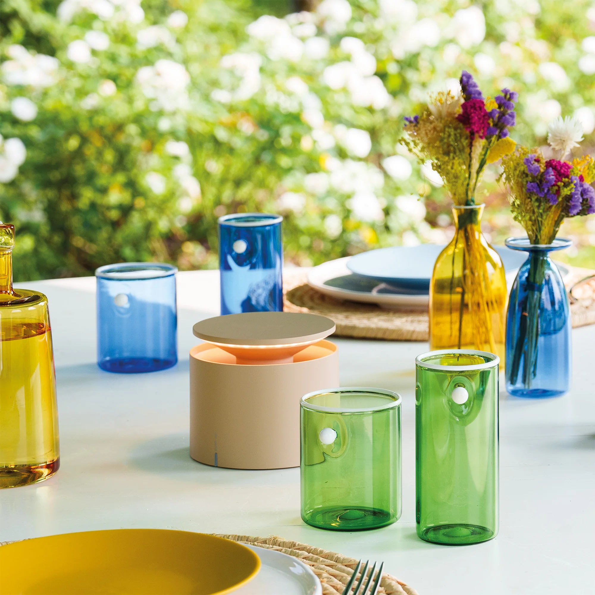 Lampe de table rechargeable et portable avec allumage par bouton poussoir : elle s'allume en soulevant la partie supérieure et s'éteint en l'abaissant. Equipé de commandes tactiles intégrées à la base pour régler l'intensité lumineuse et sélectionner la température de couleur (2200K, 2700K, 3000K). Structure en aluminium avec indice de protection IP54, adaptée aux environnements intérieurs et extérieurs. Base de chargement par contact incluse. Chargeur non inclus. Disponible en plusieurs couleurs.